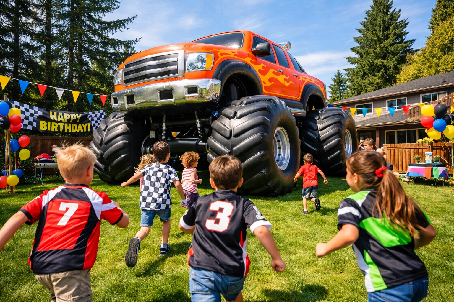 For the kids who love everything loud, fast, and rugged, a Monster Truck theme is a guaranteed winner. This theme is all about high energy and big obstacles. You can set up "racing lanes" in your yard and use our monster truck bounce house rental as the centerpiece.